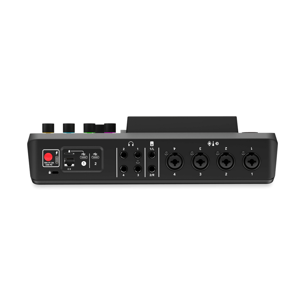 Le RØDECaster Pro II offre des options de connectivité inégalées, le rendant extrêmement polyvalent pour toute application de création de contenu. Connectez des microphones, des guitares, des basses, des claviers et des appareils de niveau ligne à l'aide des quatre prises combo Neutrik™. Surveillez votre audio avec quatre paires de casques via les sorties casque haute puissance ou des haut-parleurs via les sorties ligne équilibrées de ¼ de pouce. Enregistrez des appels téléphoniques de qualité ultra-élevée ou diffusez de l'audio en haute définition via les connexions Bluetooth® avancées. Connectez simultanément deux ordinateurs ou appareils mobiles à l'aide des interfaces USB doubles pour tout, de l'enregistrement de podcasts à distance à la rationalisation de configurations de streaming complexes. C'est le centre de contrôle audio parfait pour tout créateur.