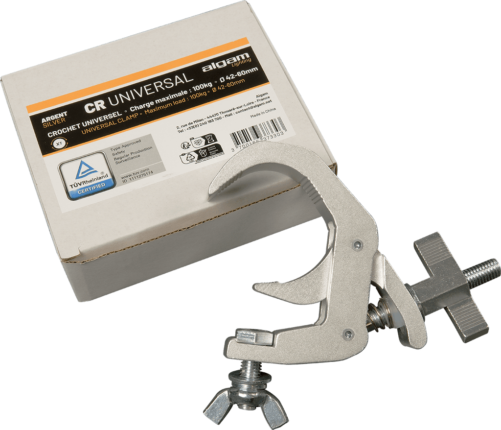 Le CR-UNIVERSAL est un crochet en aluminium pour structure, idéal pour les prestations et les installations. Conçu pour s'accrocher sur les structures présentant des sections de 42 à 60 mm, ce crochet universel polyvalent dispose d'une capacité en charge maximale de 100 kg et dispose d'un dispositif de serrage via écrou.